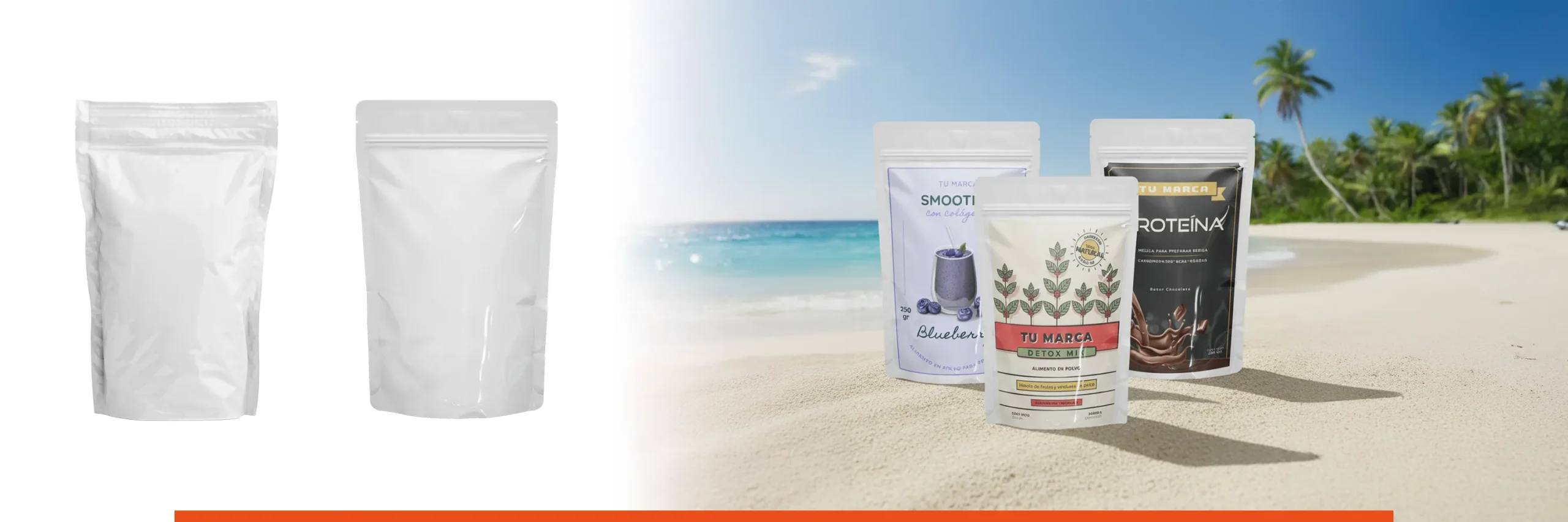 Envase flexible, una bolsa impresa termosellable con fuelles laterales planos y fuelle de fondo curvado que permite exhibir o sujetar el producto de forma vertical sobre sí mismo una vez está lleno. Bolsa Doypack o Stand-Up con cierre Zipper, de papel blanco. Ideal para envasar alimentos en polvo, granos, semillas, legumbres, cereales, dulces, etc.